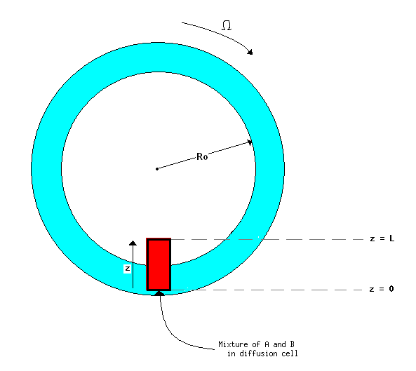 A binary liquid solution is mounted in a cylindrical cell in a very high-speed centrifuge, as shown above. The length of the cell L may be considered short with respect to the radius of rotation Ro, and the solution density may be considered a function of composition only. The goal is to determine the distribution of the two components at steady-state in terms of their partial molal volumes, position in the cell, and the pressure gradient (expressed as a function of the angular velocity, Omega). It will be assumed that the partial molal volumes and activity coefficients are constant over the range of compositions existing in the cell.