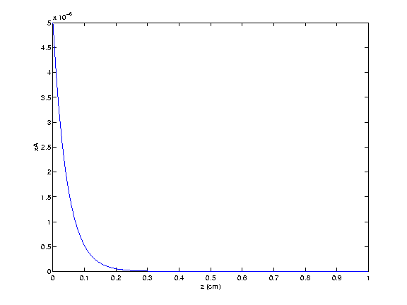 This example shows how to use the relationship obtained to solve problem 18.C in Bird, Stewart, and Lightfoot. In this example, the concentration of the A component (albumin) is so small that we assume the concentration of the B component (water) to be constant (ie- xB = xB0). This simplification allows for an analytical solution to equation 18.5-18, and thus MAPLE can easily be used to solve for the concentration profile of albumin.Data Given
