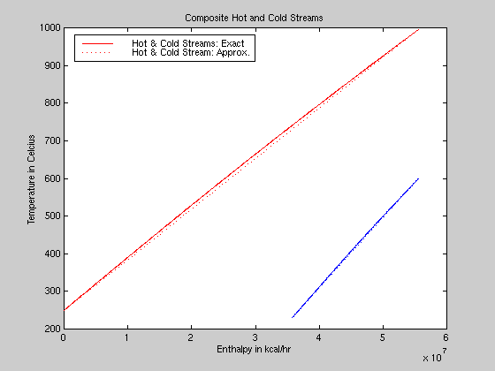 For cost analysis purposes, the cost of purely utility supported heating and cooling systems was compared to the optimum exchanger system design. Heating the cold stream from 231.1 °C to 600 °C requires 19.79 MMKcal of duty which costs $180 per hour ($1,578,966 per year) in steam. This estimate comes from Dupont's Victoria plant steam cost of $2.30 per million Btu. There are some cooling water requirements in the optimum design for the final cooling of the hot stream, but the cost of cooling water is insignificant in comparison to steam. Essentially it is only the cost of the treatment and the pumping. The amount of cooling water required has been reduced through the integration of the heat system.